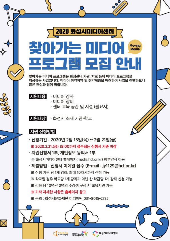 1. 2020 찾아가는 미디어 프로그램 참여기관 모집 ,장소:화성시미디어센터,기간:2020년 2월 12일~2020년 2월 21일