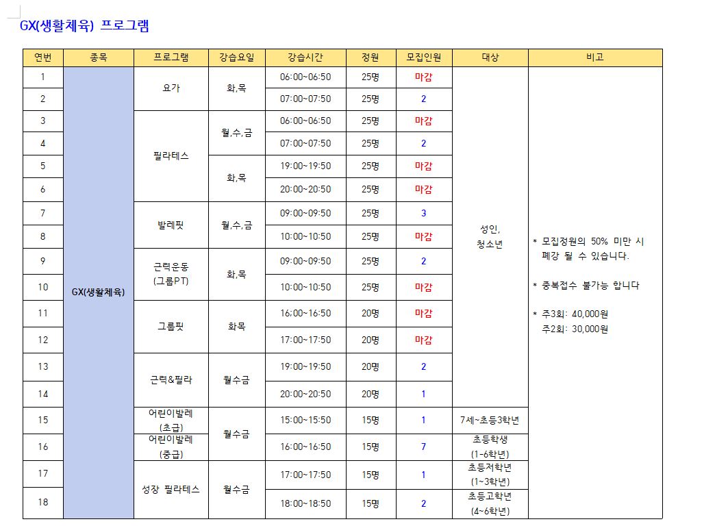 수영(성인,청소년) : 새벽수영(진도.마스터즈), 오전수영(진도.마스터즈), 저녁수영(진도.마스터즈), 아쿠아로빅, 청춘반은