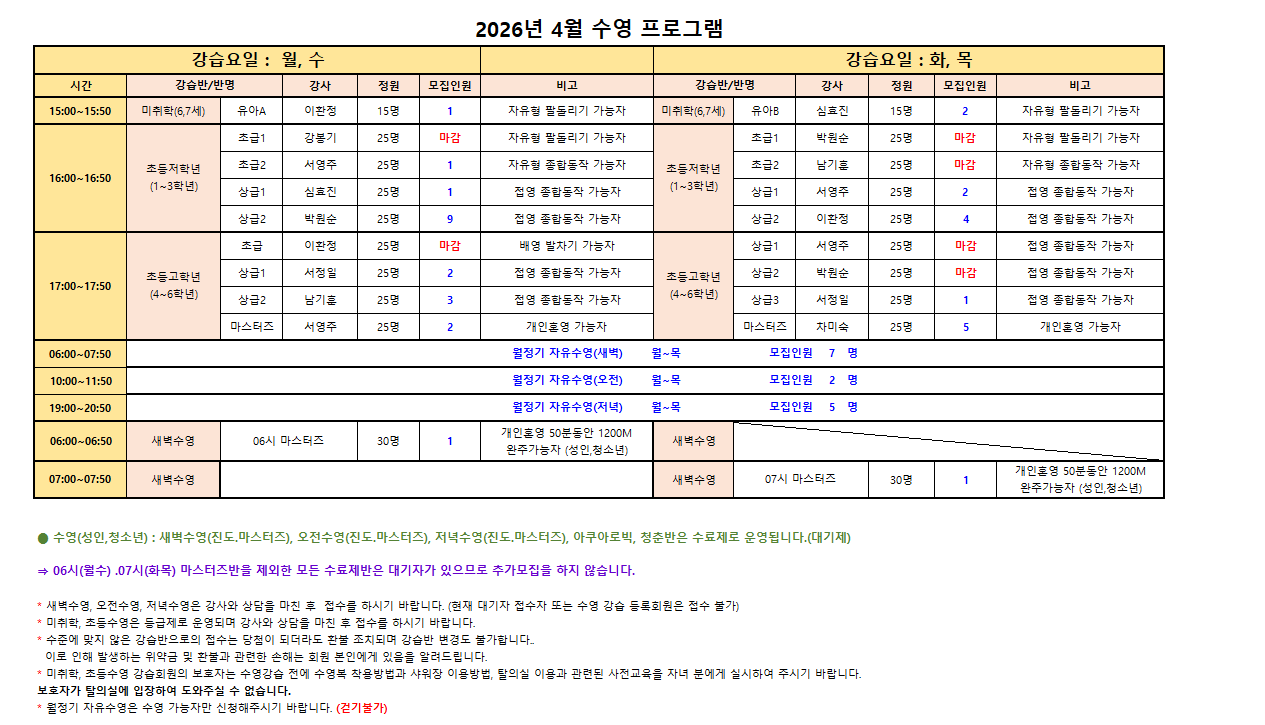 ⇒ 06시(월수).07시(화목) 마스터즈반을 제외한 모든 수료제반은 대기자가 있으므로 추가모집을 하지 않습니다.