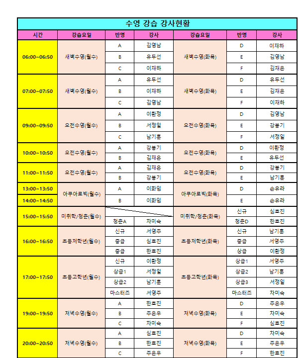 [스포츠] 수영 강습 강사 현황 작성자 관리자 작성일 2025년 12월 31일 11시 35분 32초 조회 422 수영강습 강사현황 .png [ Size : 47.96KB, Down : 146 ] 미리보기 다운로드 수영강습 강사현황 목록보기