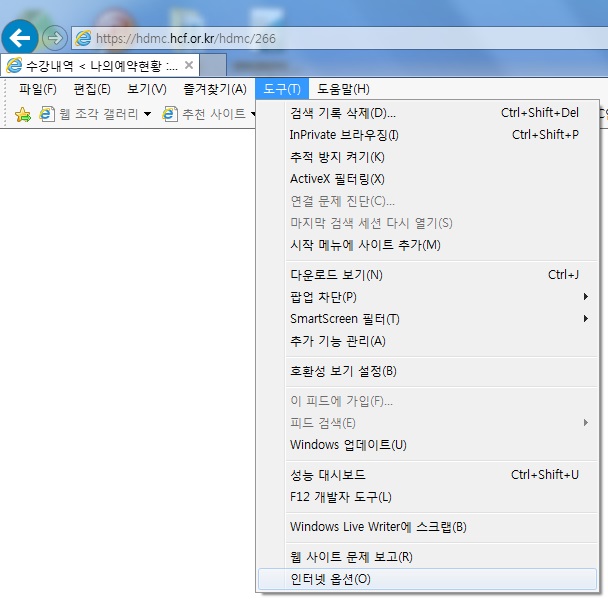 1. 브라우저 상단의 도구메뉴에서 인터넷옵션을 선택합니다.