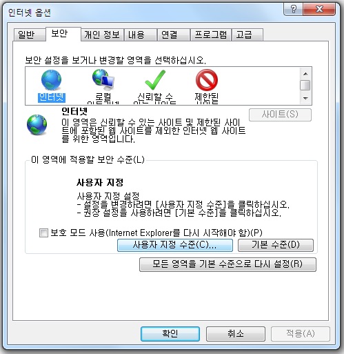 2. 옵션창에서 보안탭을 선택하고 하단의 사용자지정수준을 클릭합니다.