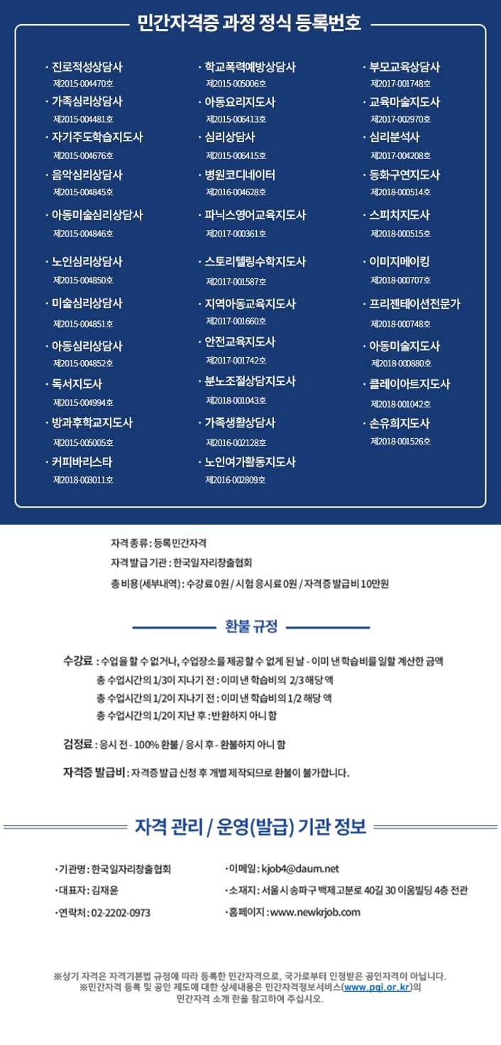 프레젠테이션전문가, 바리스타, 지역아동교육지도사, 노인심리상담사, 자기주도학습지도사, 병원코디네이터, 학교폭력예방상담사, 아동요리지도사, 안전교육지도사, 부모교육상담사, 스토리텔링수학지도사, 아동심리상담사, 분노조절상담지도사, 스피치지도사, 가족심리상담사, 아동미술지도사, 진로적성지도사, 심리분석사, 교육마술지도사, 심리상담사, 미술심리상담사, 음악심리상담사, 방과후학교지도사, 독서지도사, 아동미술심리상담사, 동화구연지도사, 이미지메이킹, 손유희지도사, 클레이아트지도사, 파닉스영어교육지도사, 노인여가활동지도사, 가족생활상담사