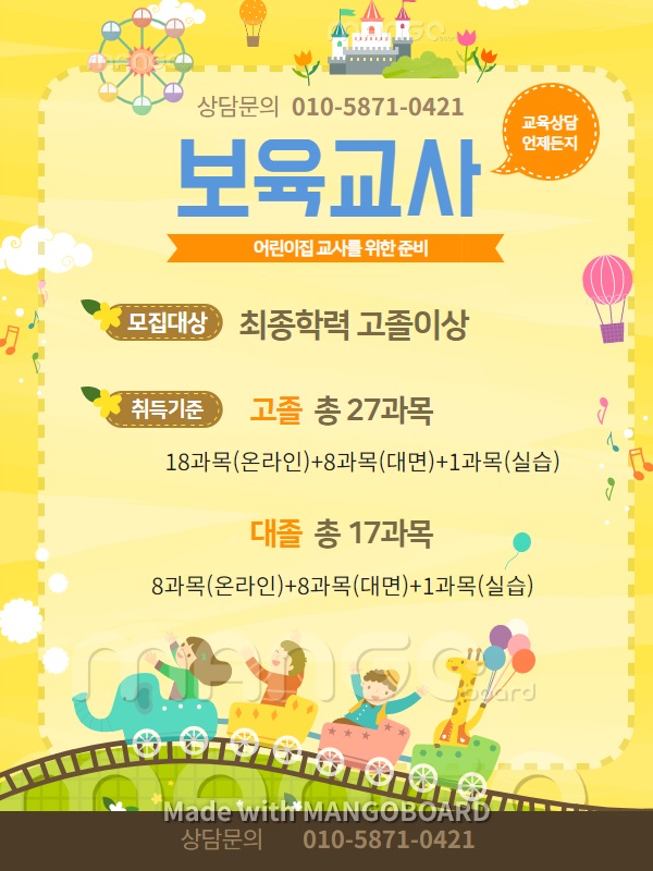 앞으로 유치원, 어린이집도 의무교육으로 바뀐다고 하니 자 격 증을 취 득해 놓으시면 전망 및 수요부분에 있어 가장 확실한 자 격 증입니다.