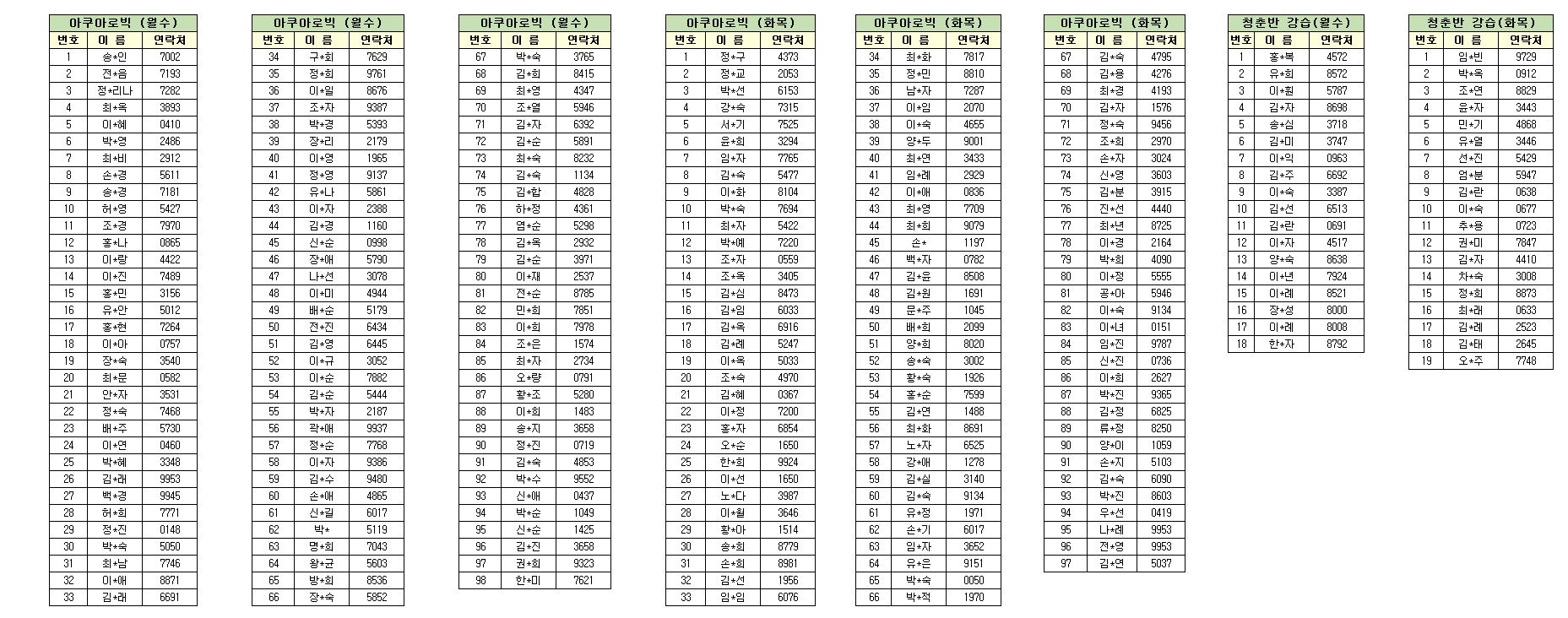 2024년 12월 14일 18시 기준 수영 프로그램 대기자 현황입니다. 대기자 중 2025년 1월 강습 순번도래자 및 등록날짜, 결제방법 등의 자세한 사항은 12월 20일부터 정보마당 → 공지사항을 통해 안내해드리오니 확인 부탁드립니다.